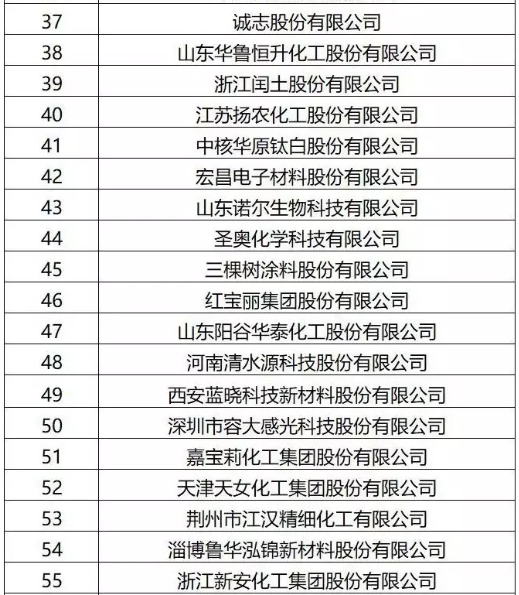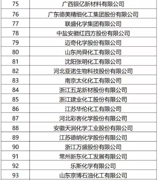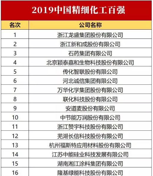 2019年11月28日,在由全國精細化工原料及中間體行業協作組、中國化工情報信息協會在廣西北海聯合主辦,中國化工信息中心承辦,北海市鐵山港區人民政府、北海市鐵山港(臨海)工業區管理委員會協辦的“第十九屆國際精細化工原料及中間體(鐵山港)峰會暨2019中國精細化工百強發布會”上,公布了“2019中國精細化工百強”榜單。
